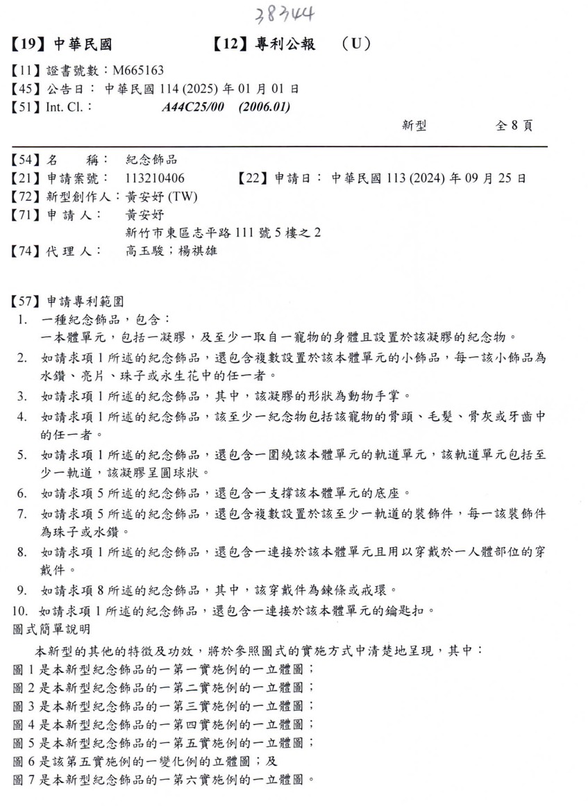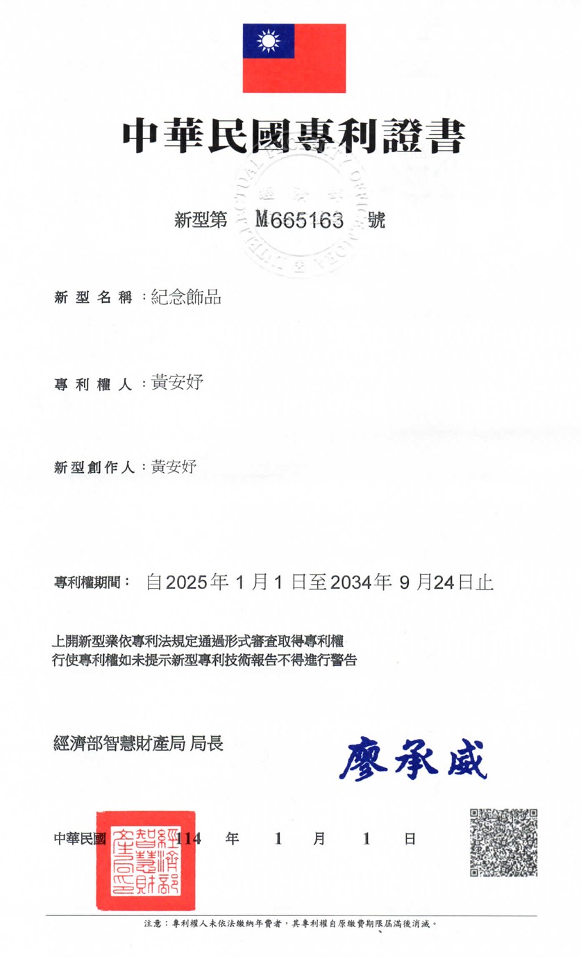 寵物天堂,秉持「讓愛不止於告別」的理念,近日正式取得中華民國新型專利第 M665163 號《紀念飾品(寵物骨灰飾品)》證書,由智慧財產局於 2025 年 1 月 1 日核發,專利權期間自 2025 年至 2034 年止。